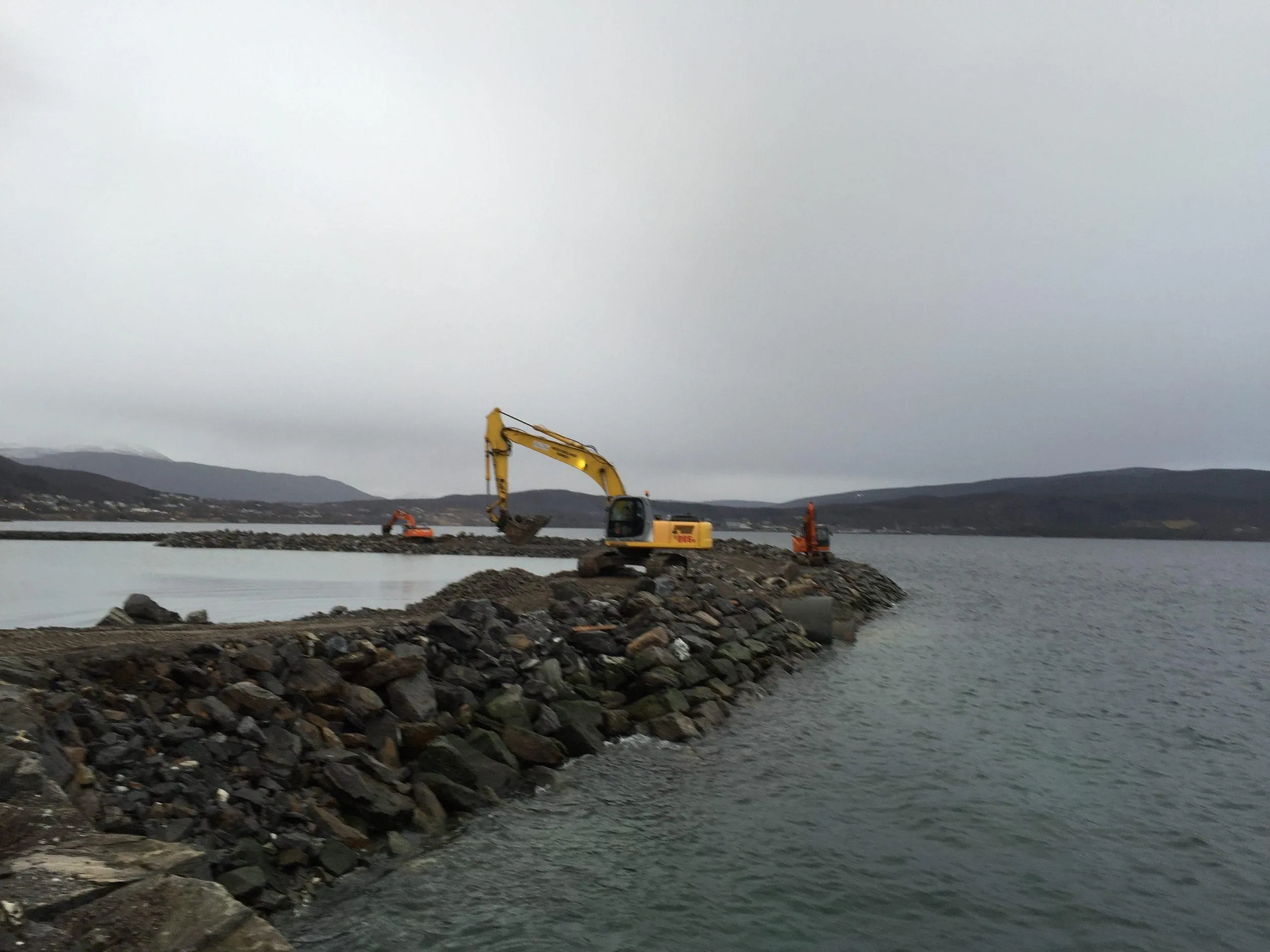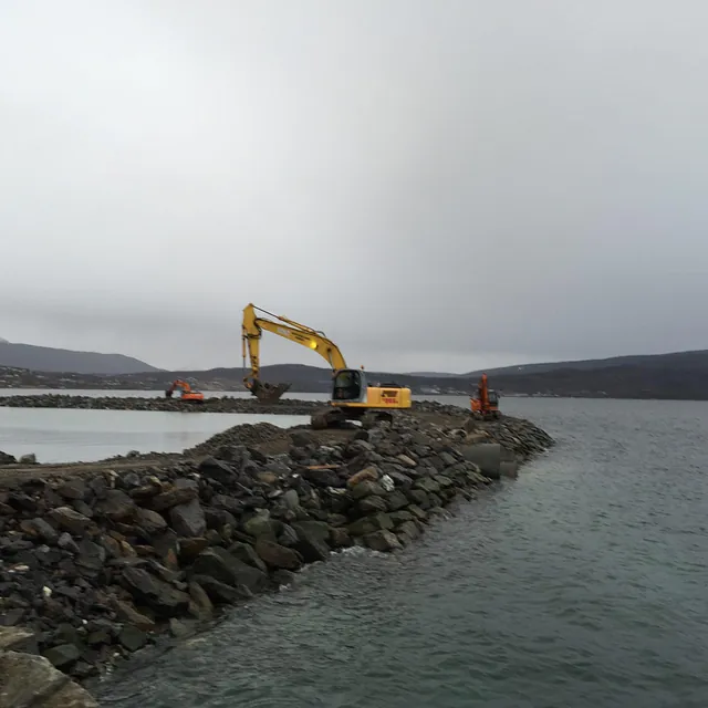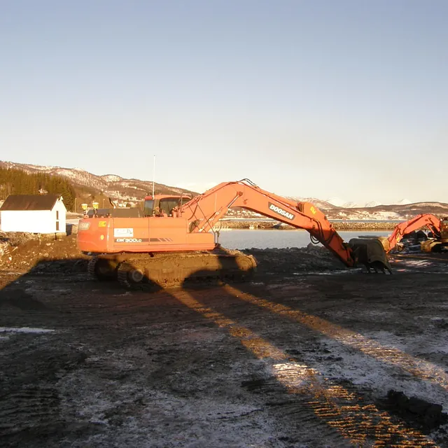 Sprengning og opplasting av ca 17000 tfm3 fjell i gammel molo. Plastring av 2 stk moloer på henholsvis 140 og 220 meter areal ca 6300m2. Plastringsdybde kt -4,5 Masseflytting ca 25000 m3. Mudring til Kt -6,5. Avretting av molo ferdig produkt. Foretaket var ansvarlig utførende for opparbeidelse av 2 stykk molo. Det ble sprengt og fjernet en mindre fjellknaus ved fylkesveien. Samt den gamle moloen. Steinmassene fra fjellknausen ble brukt som fyllingsmasse, slik at det ble etablert en forbindelse mellom land og de dumpete massene. Moloenes ytterside ble plastret og lagt opp etter profiltegningene. I moloene skulle det legges fram trekkerør for strøm, monteres fundamenter for lysmaster og etableres fortøyningsfester for flytebryggene. Plastring, mudring, sprengning. Avretting av molo ferdig produkt. Det ble også bygget en anleggsvei fra den gamle moloen til molo 1. Anleggsveien ble bygget i fjæra mot flytebryggene.