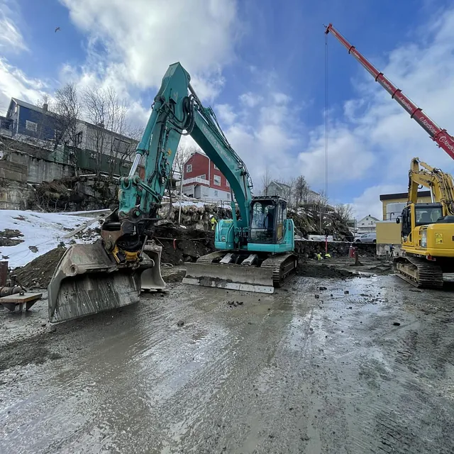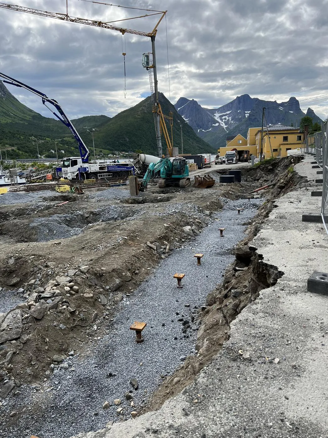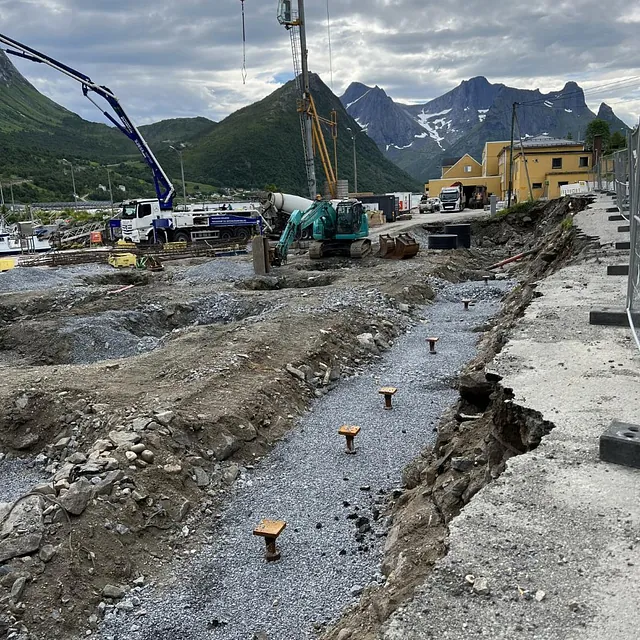 Prosjektet omhandler utvidelse av kai på Husøy og fundamentering for nytt bygg. Arbeidene skal gjøres i forbindelse med at Br.Karlsen skal bygge nytt produksjonsbygg for mottak av fisk. Vi har stått for grunnarbeidene. Spylrensk av areal: All begrodd stein skal rengjøres av fyllingsfront molo. Riving av bygningsdeler. Graving til generelle gravenivåer. Utlegging av løsmasser i lag. Avretting.